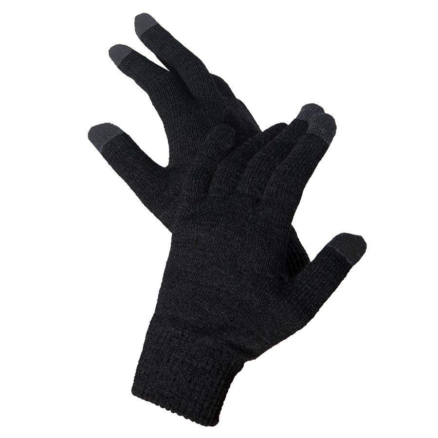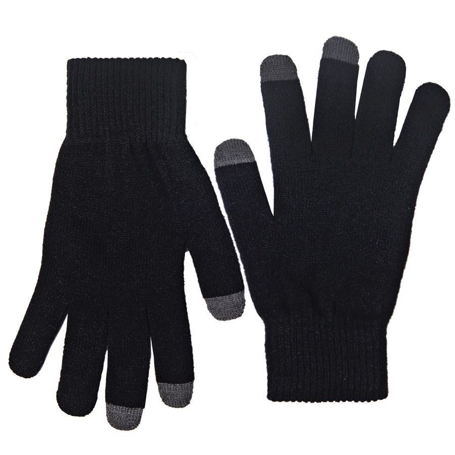 Перчатки из теплого и мягкого акрила с сенсорными наконечниками. Основной цвет: черный. Цвет сенсорных вставок: серый меланж. Цвет, близкий к Pantone 426C.