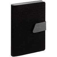 Ежедневник с гибкой обложкой, выполнен из материала La Fite, черный АА и Nubuck, серый СС, дополнен серым ляссе и хлястиком на кнопке.