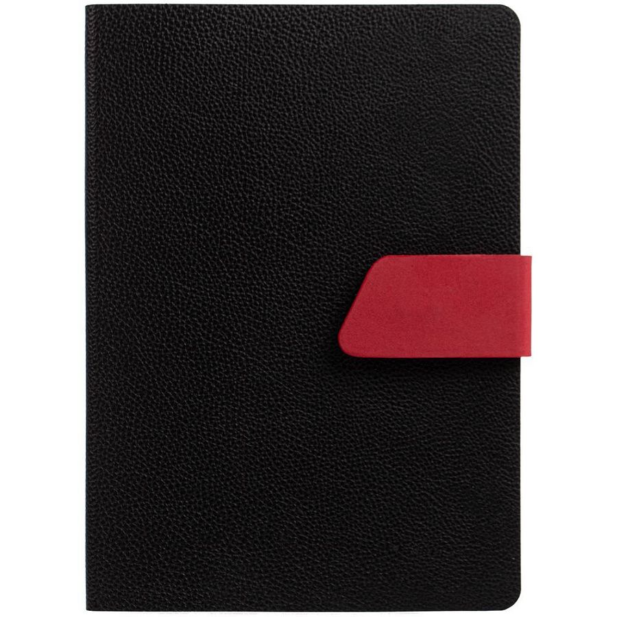 Ежедневник с гибкой обложкой, выполнен из материала La Fite, черный АА и Nubuck, красный РР, дополнен красным ляссе и хлястиком на кнопке.