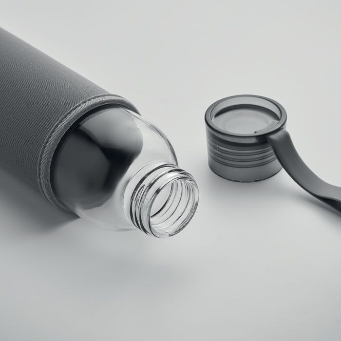 Бутылка из переработанного стекла с неопреновым чехлом и полипропиленовой крышкой с силиконовым держателем. Герметична. Емкость: 500 мл.