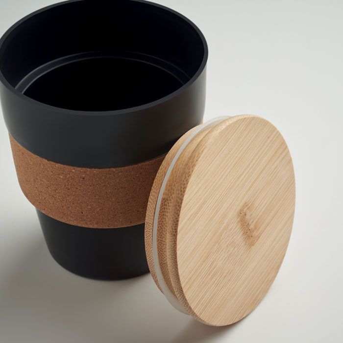 Одностенный стакан из переработанного полипропилена с пробковой защитной вставкой и бамбуковой крышкой. Объем: 300 мл. Возможна частичная теплопередача.