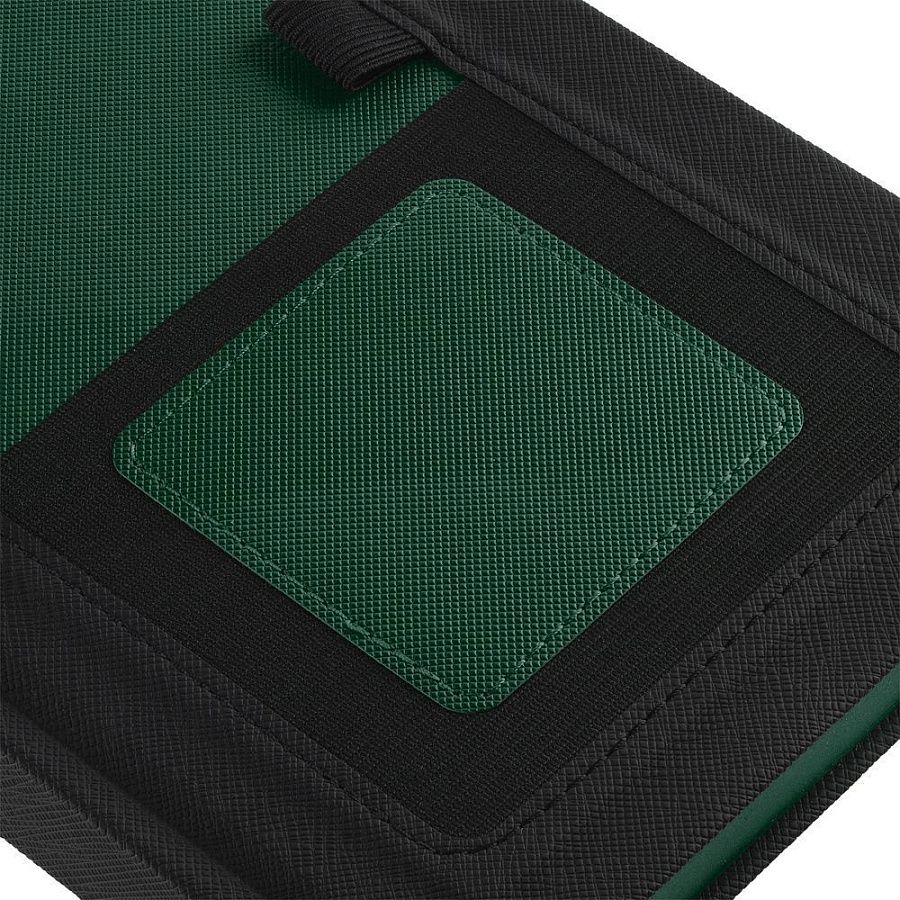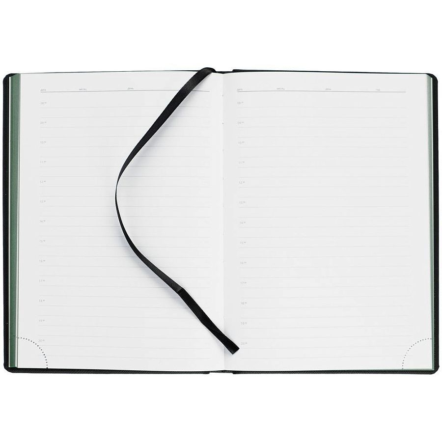 Твердая обложка выполнена из материалов Nice Touch, черный АА, и Canyon, зеленый FF. Ежедневник дополнен капталом, резинкой для ручки и ляссе черного цвета.