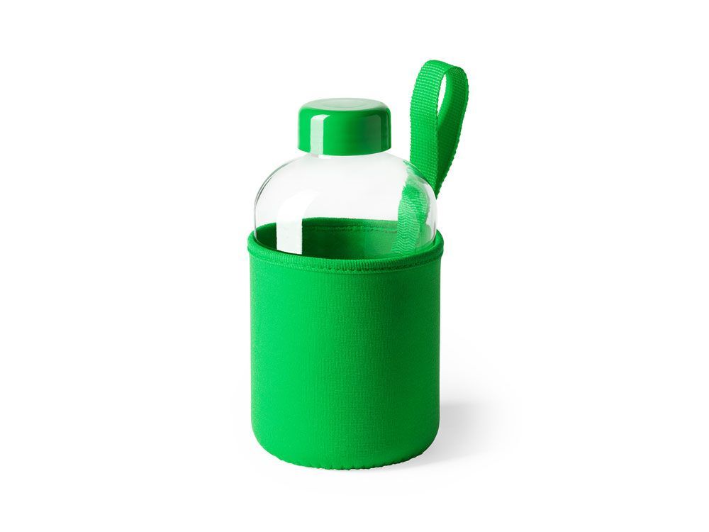 Стеклянная бутылка емкостью 600 мл. включает инновационный неопреновый чехол самых разных цветов с ручкой для переноски.