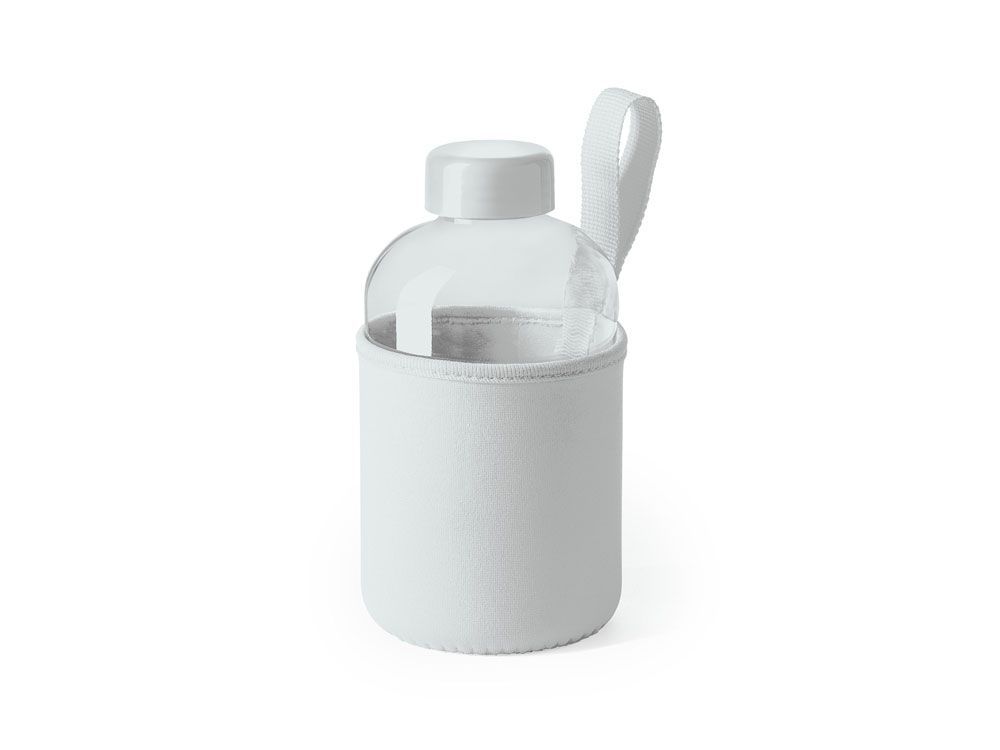 Стеклянная бутылка емкостью 600 мл. включает инновационный неопреновый чехол самых разных цветов с ручкой для переноски.