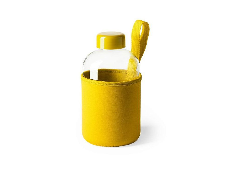 Стеклянная бутылка емкостью 600 мл. включает инновационный неопреновый чехол самых разных цветов с ручкой для переноски.