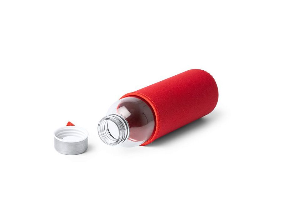 Стеклянная бутылка емкостью 500 мл, чехол из неопрена в сочетании с цветным ремешком для переноски.