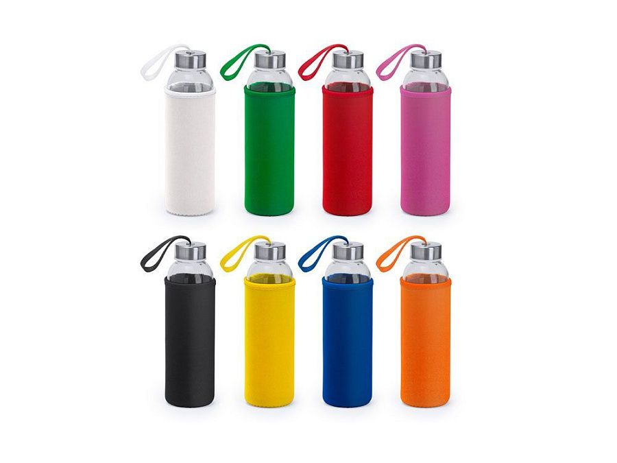 Стеклянная бутылка емкостью 500 мл, чехол из неопрена в сочетании с цветным ремешком для переноски.