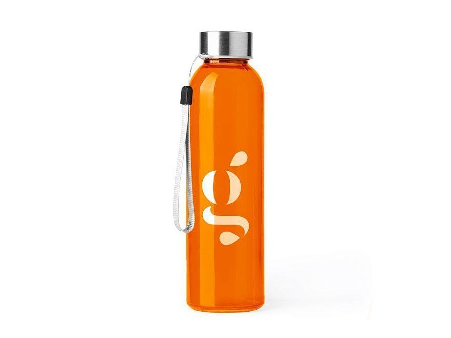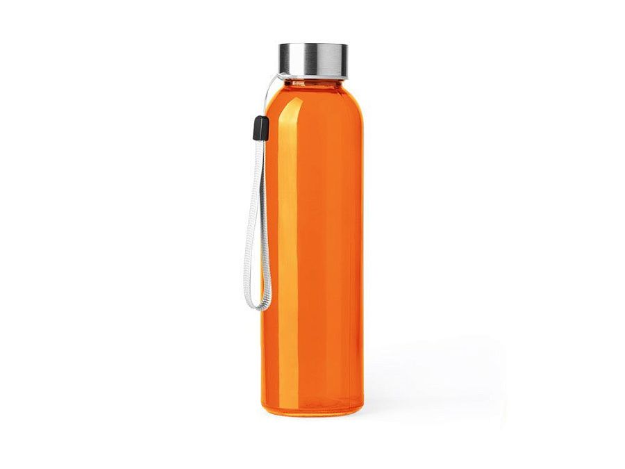 Стеклянная бутылка емкостью 500 мл. Большое разнообразие цветов, с завинчивающейся крышкой из нержавеющей стали и удобной для транспортировки благодаря ремешку серого цвета.