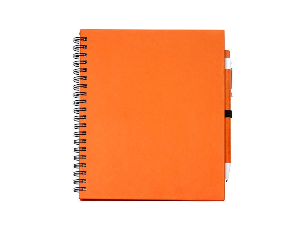 Блокнот на спирали с простыми листами и держателем для ручек. Твердая обложка и ручка из переработанного картона. 70 листов.