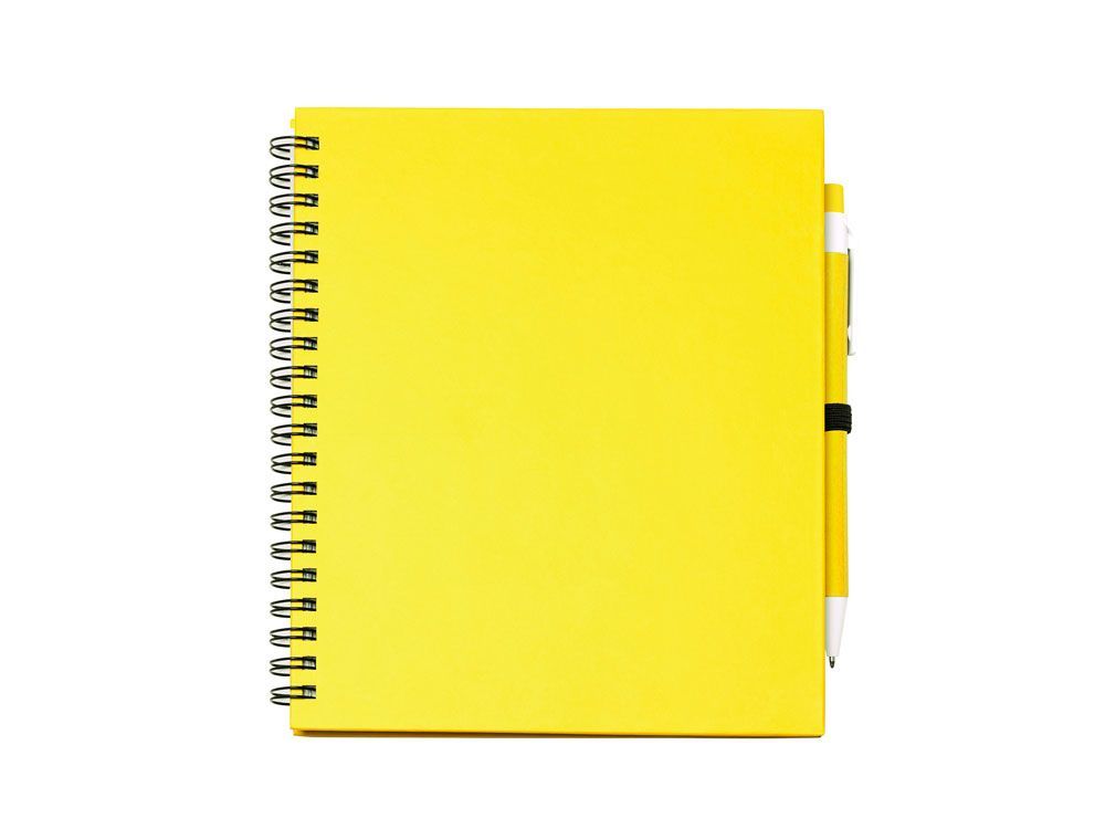 Блокнот на спирали с простыми листами и держателем для ручек. Твердая обложка и ручка из переработанного картона. 70 листов.
