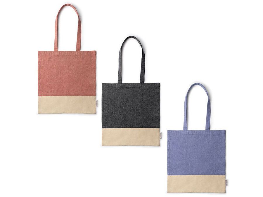 Сумка из переработанного хлопка с отделкой из натурального хлопка плотностью 120 г/м². Усиленные ручки длиной 70 см.