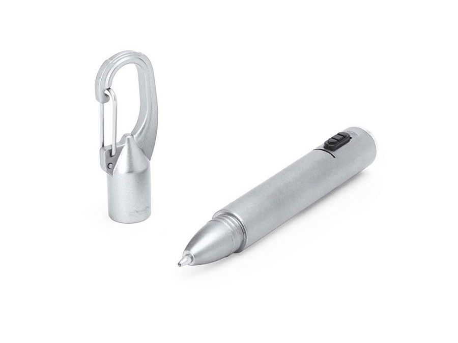 Ручка со светодиодным фонариком, доступна в различных цветах с металлическим покрытием и черной кнопкой. Встроенный карабин. Синие чернила