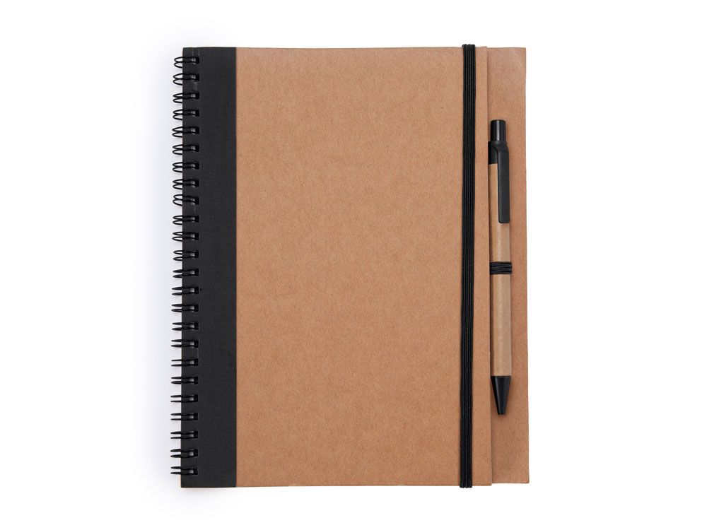 Блокнот на спирали с жесткой обложкой из переработанного картона. Включает шариковую ручку с синими чернилами. 60 простых листов.