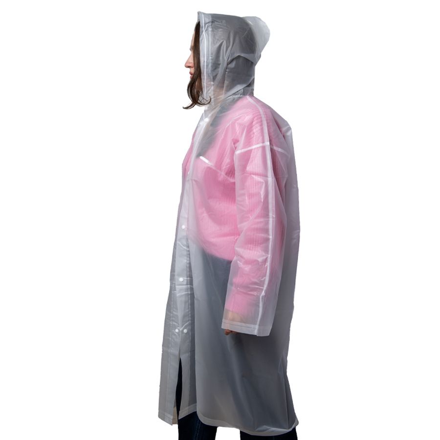 Дождевик "Pure" из непромокаемого материала EVA, толщиной 0,16 мм. Один размер, длина 118 см, ширина под грудью 68 см. Соответствует размеру XL-2XL. Прямой силуэт, втачной рукав, капюшон с завязками. Застёжка на кнопках, капюшон.