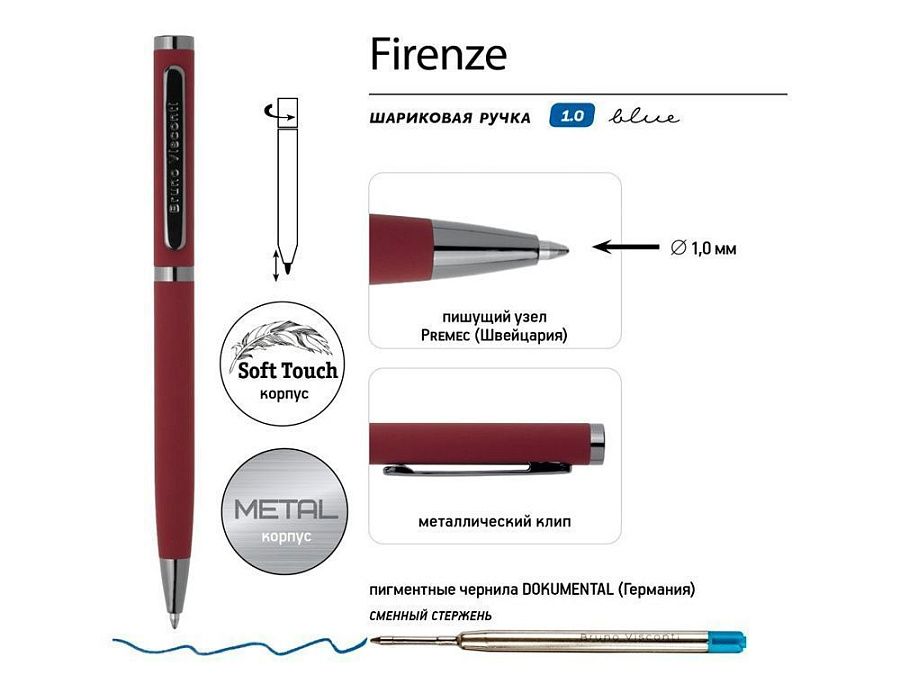 Ручка автоматическая, с легким поворотным механизмом подачи стержня. Надежный пишущий узел d 1,0 мм (от швейцарского производителя Premec) гарантирует высокое качество также, как и пигментные чернила Dokumental (Германия). Благодаря им писать ручкой «Firenze» одно удовольствие – она мягко скользит по поверхности бумаги, оставляя ровную, четкую линию.