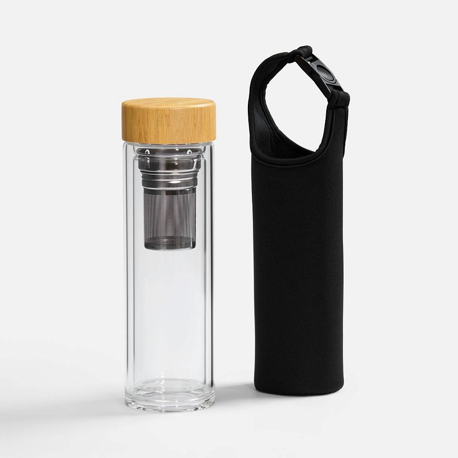 бутылка - боросиликатное стекло; чехол - неопрен; ситечко - нержавеющая сталь; крышка - бамбук, пластик