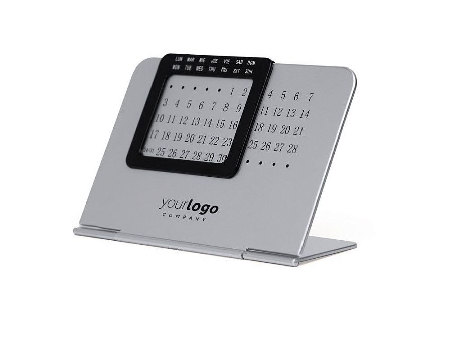 "Вечный" настольный календарь, состоящий из двух частей: одной серебряной подставки с числовой панелью и черной выдвижной рамки с днями недели на испанском и английском языках.