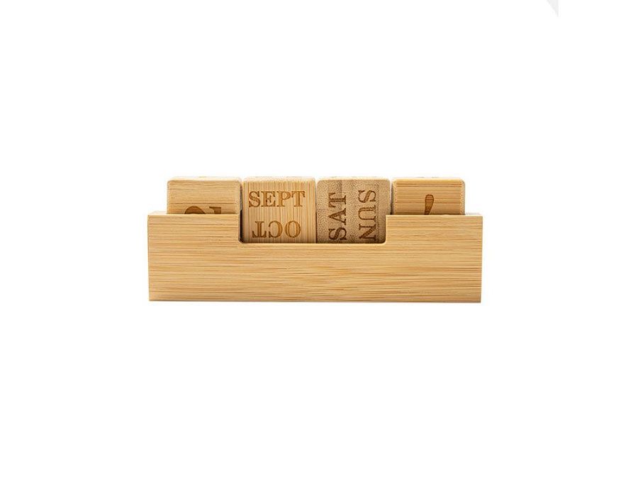 "Вечный" настольный календарь из бамбука, состоящий из одной подставки и четырех блоков с гравировкой.