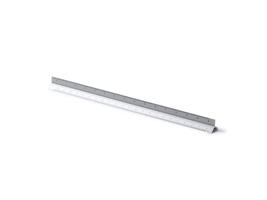 Алюминиевая линейка треугольной формы (30 см). Шкалы: 1:20, 1:25, 1:50, 1:75 и 1:100. Специальная гладкая поверхность для нанесения логотипов.