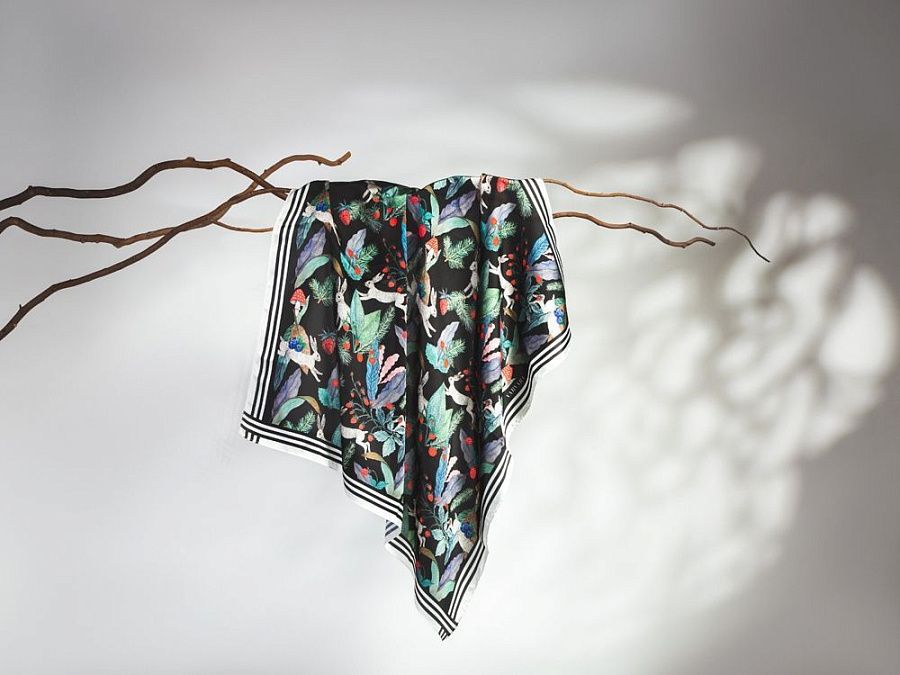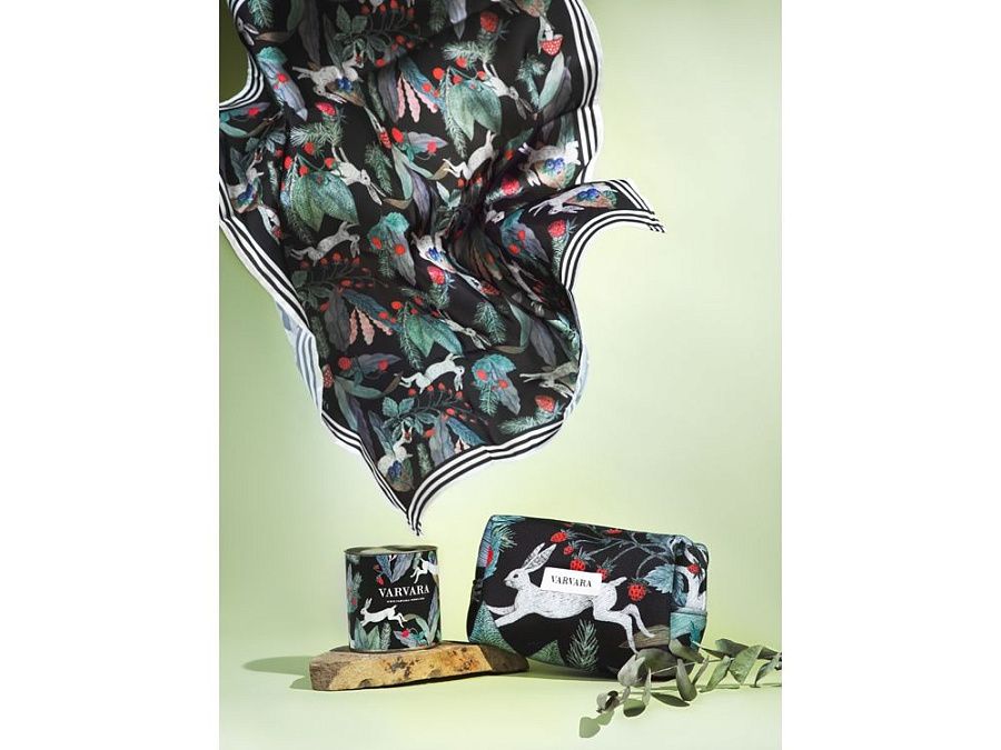 Принт нарисован художницей вручную специально для бренда Varvara. Художница размышляла на тему русской природы, культуры и искусства - тут и лесная земляника, и сочная зелень, и конечно, сказочные зайцы - как будто только что сошли с полотен В. Васнецова.