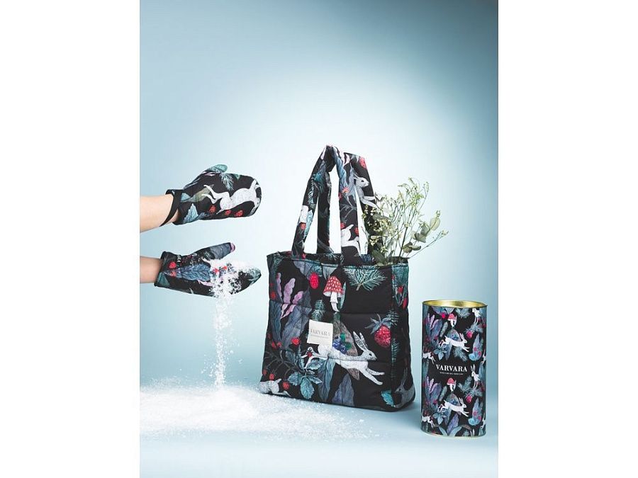 Авторский принт написан художницей вручную специально для российского бренда Varvara. Художница размышляла на тему русской природы, культуры и искусства - тут и лесная земляника, и сочная зелень, и конечно, сказочные зайцы - как будто только что сошли с полотен В. Васнецова.