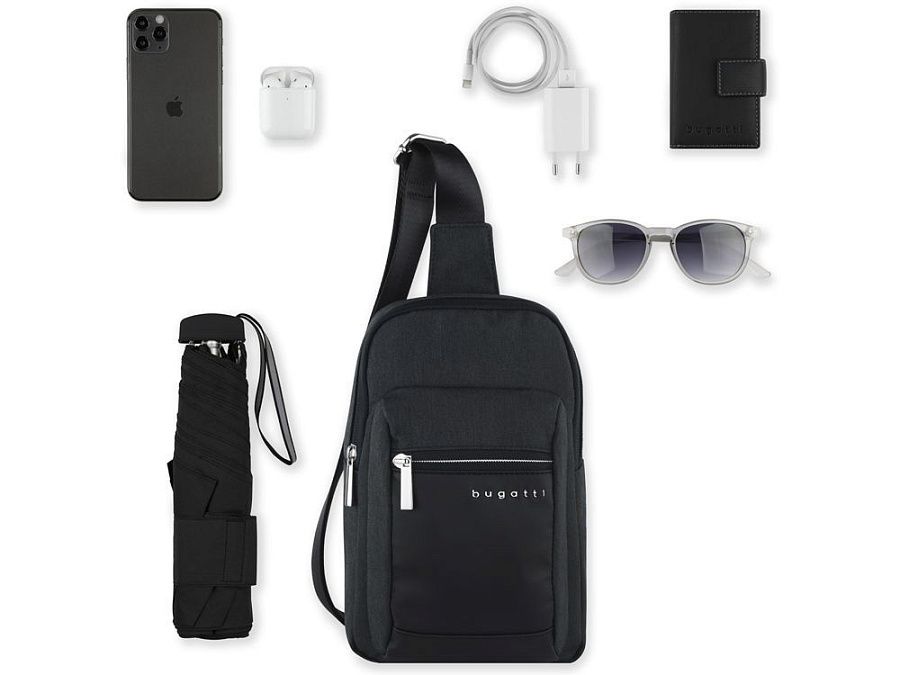 Внешняя организация: передний карман на молнии, задний карман на молнии, регулируемый плечевой ремень (до 125 см)