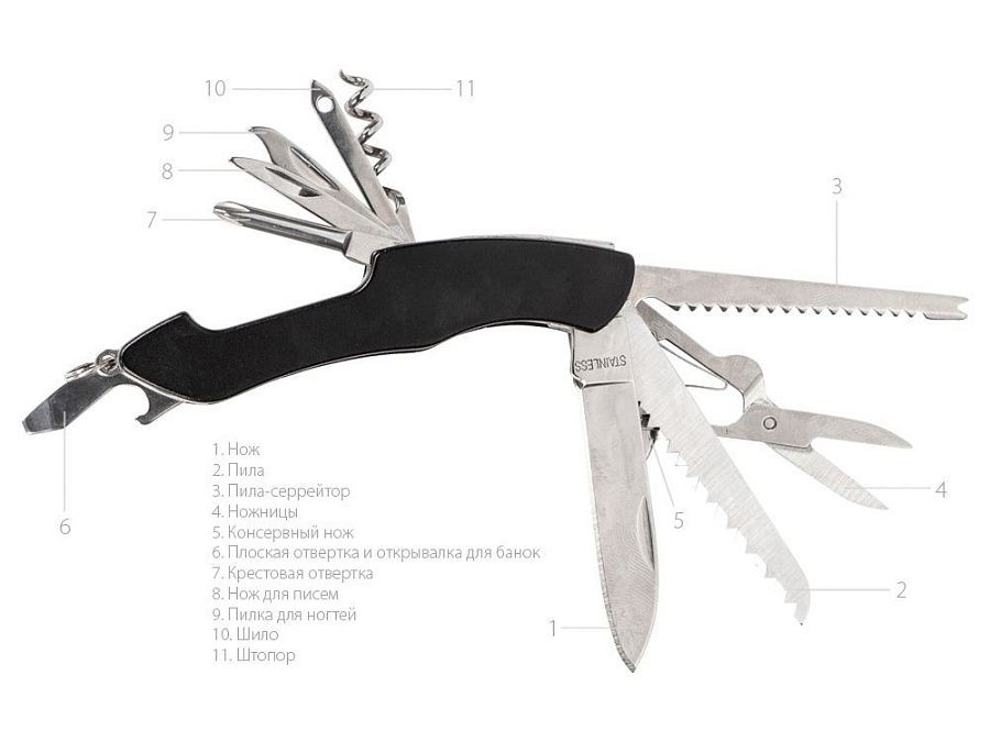 Складной нож-мультитул из нержавеющей стали содержит 11 функций, которые закрывают большую часть потребностей, возникающих перед современным человеком в условиях города или в походе.