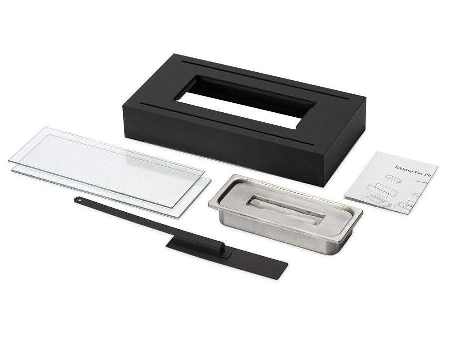 металлическая база, стеклянные стенки- 2шт, емкость для топлива, заглушка для тушения пламени, керамическая вата, инструкция по применению