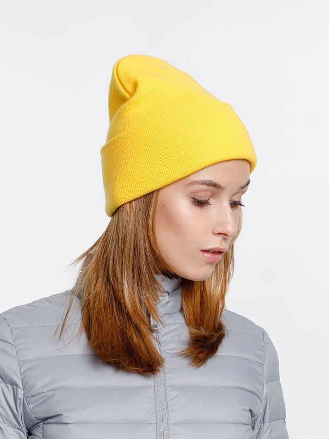 Двухслойная шапка из акриловой пряжи с регулируемым отворотом 7–10 см.