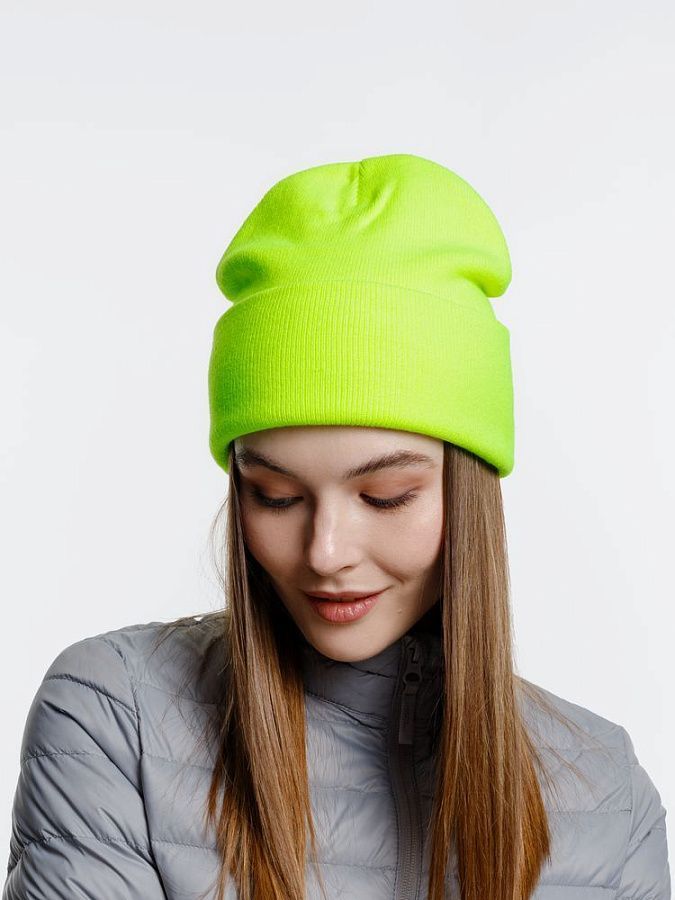 Двухслойная шапка из акриловой пряжи с регулируемым отворотом 7–10 см.
