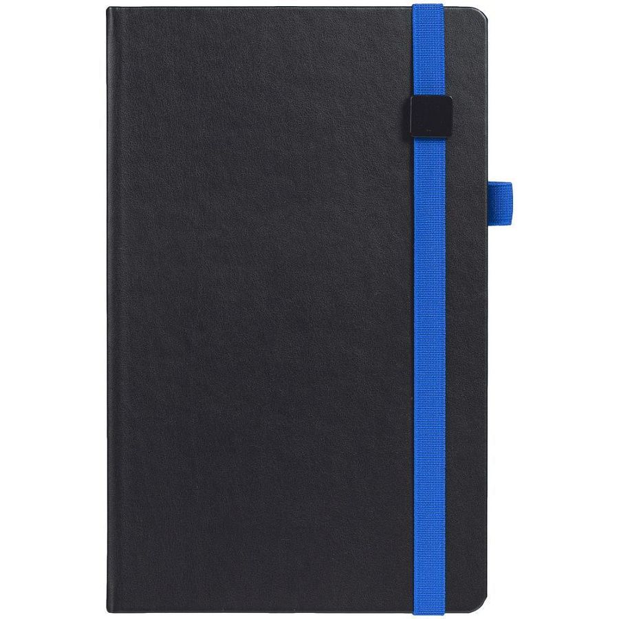 Ежедневник с полутвердой обложкой, выполнен из материала Waltz, черный АА, дополнен синей резинкой с металлическим шильдом и ляссе.