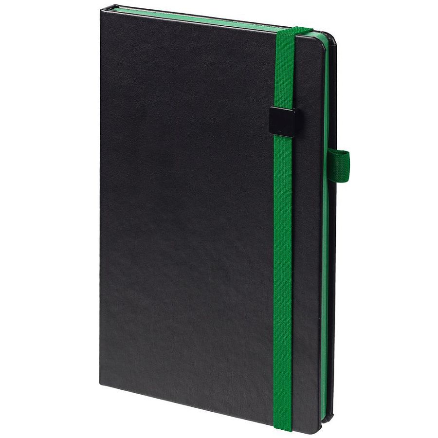Ежедневник с полутвердой обложкой, выполнен из материала Waltz, черный АА, дополнен зеленой резинкой с металлическим шильдом и ляссе.