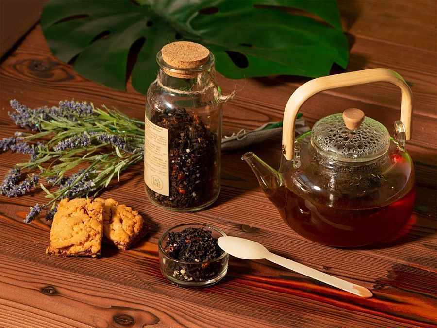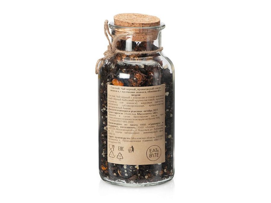 Состав: чай чёрный с ананасом и соком ананаса (чай чёрный байховый крупнолистовой, кусочки ананаса, сок ананаса), медовые гранулы, облепиха сублимированная, ароматизатор натуральный "Ананас".