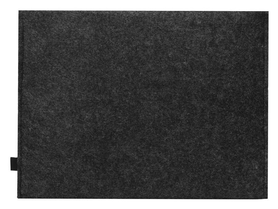 Чехол для ноутбука выполнен из фетра толщиной 3 мм. С передней стороны расположен органайзер размером 13x27 см для канцелярских принадлежностей, карт и телефона. Чехол фиксируется в закрытом виде с помощью эластичной ленты.