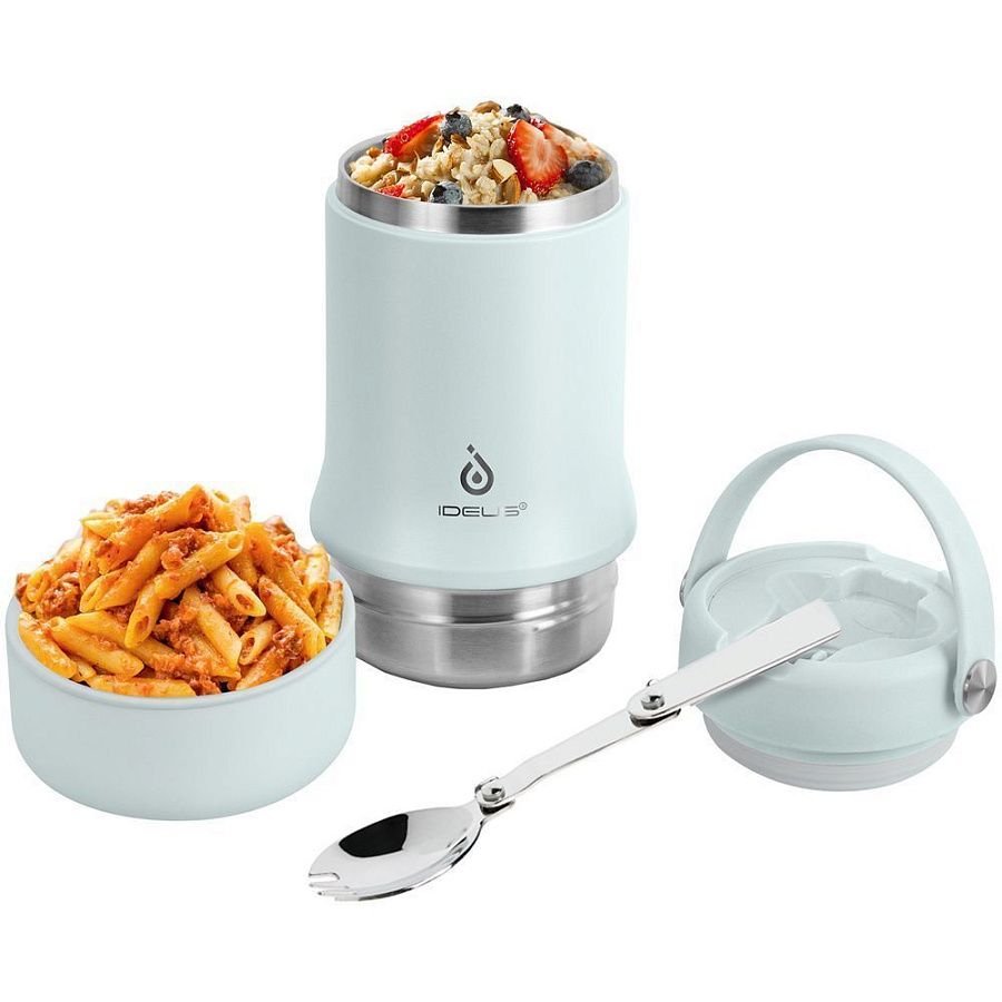 Tabenodo — универсальный многофункциональный термос для работы, школы, похода и путешествия. В компактном корпусе разместились ложка, тарелка и емкость для любимого блюда. Матовая поверхность приятна на ощупь, а силиконовая ручка удобна для переноски.