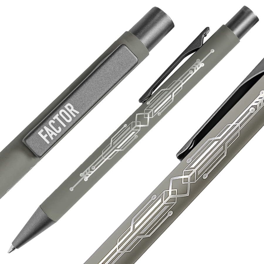 Модель ручки FACTOR – это оптимальный выбор для тех, кто предпочитает добротное качество, надежность и изящную простоту. Этой ручкой писать легко и удобно, она буквально скользит по бумаге благодаря качественным чернилам и надежному пишущему узлу. Все эти качества позволят ручке служить вам верой и правдой долгое время. А клип и корпус данной модели отлично подойдут для нанесения вашего логотипа. • Pantone, близкий к Cool Gray 8 C• Размер 140*10 мм• Корпус из алюминия с покрытием soft touch• Металлический клип-прищепка серого цвета • Пластиковые носик и кнопка в цвет клипа• Нажимной механизм подачи стержня• Пулевидный пишущий узел 1.0 мм• Длина линии письма 1000 м • Чернила Dokumental. Цвет чернил синий• Сменный стержень Parker type• При гравировке вскрывается натуральный цвет алюминия, который может быть либо более белый, либо более серого оттенка.Результат гравировки зависит от настроек оборудования!