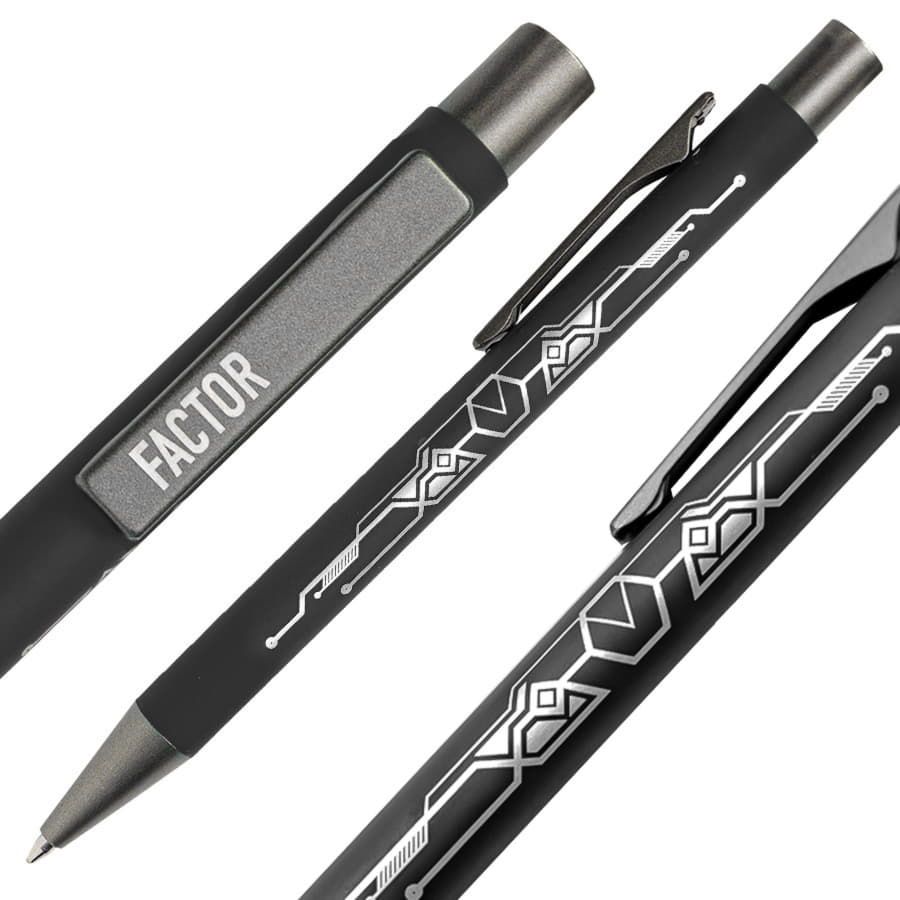 Модель ручки FACTOR – это оптимальный выбор для тех, кто предпочитает добротное качество, надежность и изящную простоту. Этой ручкой писать легко и удобно, она буквально скользит по бумаге благодаря качественным чернилам и надежному пишущему узлу. Все эти качества позволят ручке служить вам верой и правдой долгое время. А клип и корпус данной модели отлично подойдут для нанесения вашего логотипа. • Pantone, близкий к Black• Размер 140*10 мм• Корпус из алюминия с покрытием soft touch• Металлический клип-прищепка серого цвета • Пластиковые носик и кнопка в цвет клипа• Нажимной механизм подачи стержня• Пулевидный пишущий узел 1.0 мм• Длина линии письма 1000 м • Чернила Dokumental. Цвет чернил синий• Сменный стержень Parker type• При гравировке вскрывается натуральный цвет алюминия, который может быть либо более белый, либо более серого оттенка.Результат гравировки зависит от настроек оборудования!