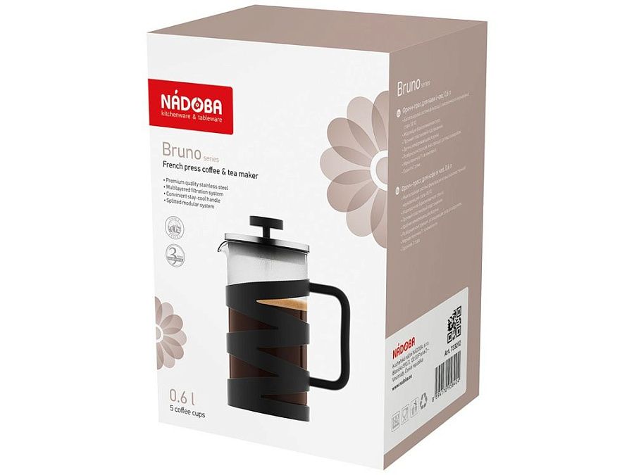 Френч-прессы серии Bruno имеют колбу, выполненную из жаропрочного боросиликатного стекла. Прочный подстаканник из высококачественного пластика обеспечивает дополнительную термоизоляцию и предохраняет колбу от повреждений. Многослойная система фильтрации френч-прессов выполнена из высококачественной нержавеющей стали 18/10. Удобная ручка не нагревается и не выскальзывает из рук. Разборная конструкция изделий и системы фильтрации облегчают легкий и качественный уход. В комплекте предусмотрена мерная ложка 7г для точной дозировки продуктов. В серию входят френч-прессы объёмом 0,8 и 0,6 л. Гарантия на френч-прессы серии Bruno 3 года.
