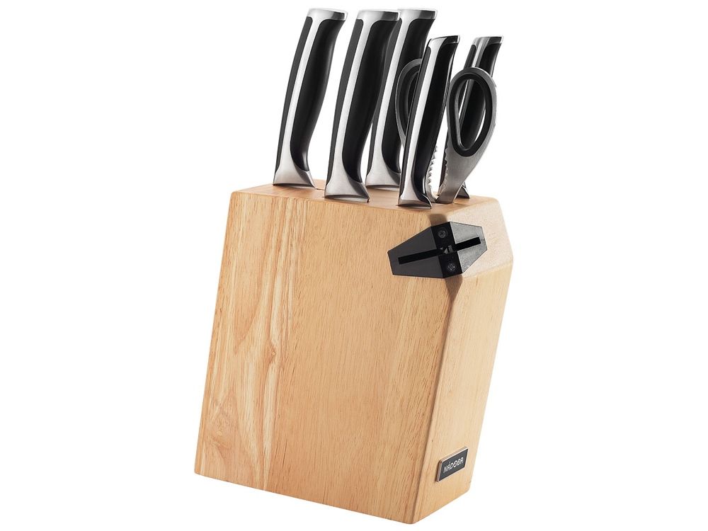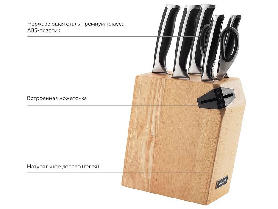 - Блок набора ножей, входящего в серию, изготовлен из натурального дерева (гевея) и оснащён встроенной ножеточкой. Ножницы из набора оснащены открывалкой для бутылок.