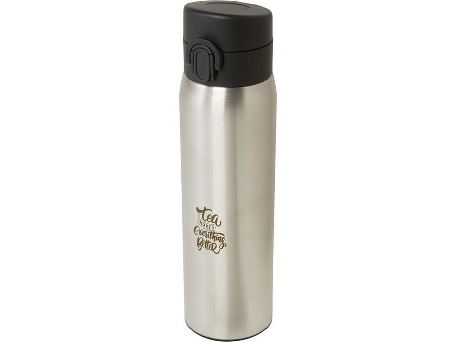 Стильная фляга-термос из переработанной нержавеющей стали, сертифицированная RCS, с простым механизмом открытия с помощью кнопки. Фляга герметична, а благодаря медной вакуумной изоляции напитки будут сохраняться горячими или холодными в течение нескольких часов. Объем составляет 450 мл. Поставляется в подарочной коробке из переработанного картона. Recycled stainless steel, Recycled PP Plastic. Packaging: FSC Mix Credit P5.1 CU-COC-877277.