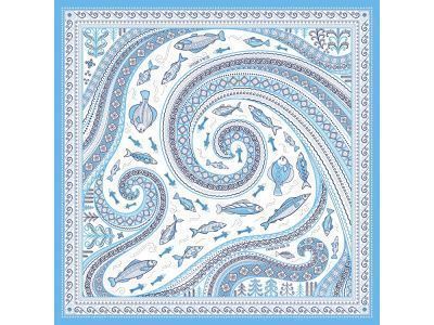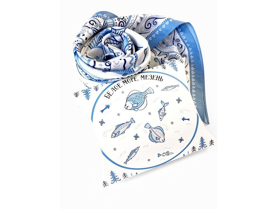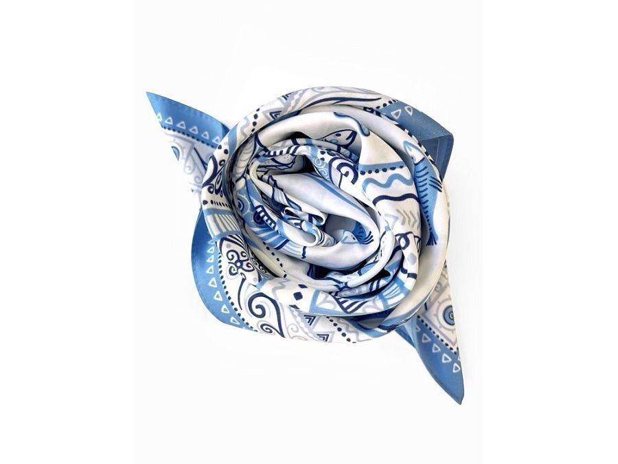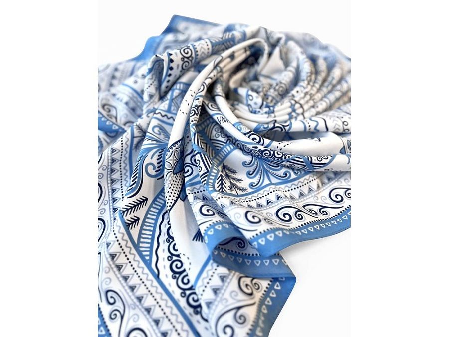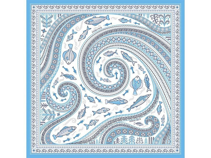 Платок из коллекции бренда "Русские в моде" посвящён уникальному искусству этой росписи. Изображения спиралевидных орнаментов в виде волн, елочек, рыбок украшают дизайн. Все это означает плодородие стихий земли и воды, энергию солнца, богатство и процветание.