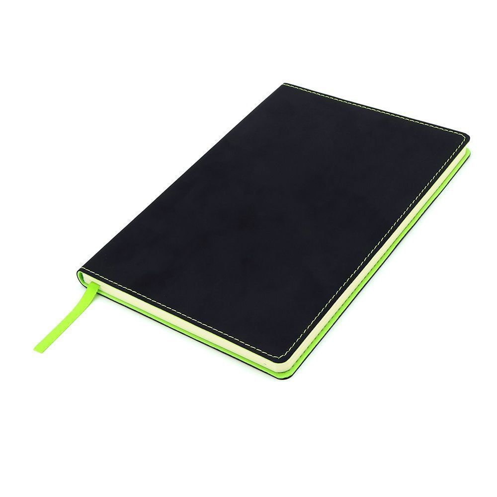 Блонот формата А5 в мягкой обложке из искусственной кожи. Материал обложки - термополиуретан. Основной цвет - чёрный; строчка по периметру, внутенний край и ляссе - зелёного цвета. Размеры: 214*144мм, 80 листов, разлинееные страницы, бумага плотностью 80г/м2.