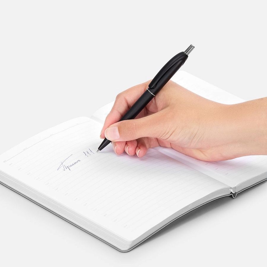 Шариковая пластиковая ручка в корпусе с эффектом «металлик» и серебристыми деталями. Приятная округлая форма клипа добавляет ручке плавности и объема.