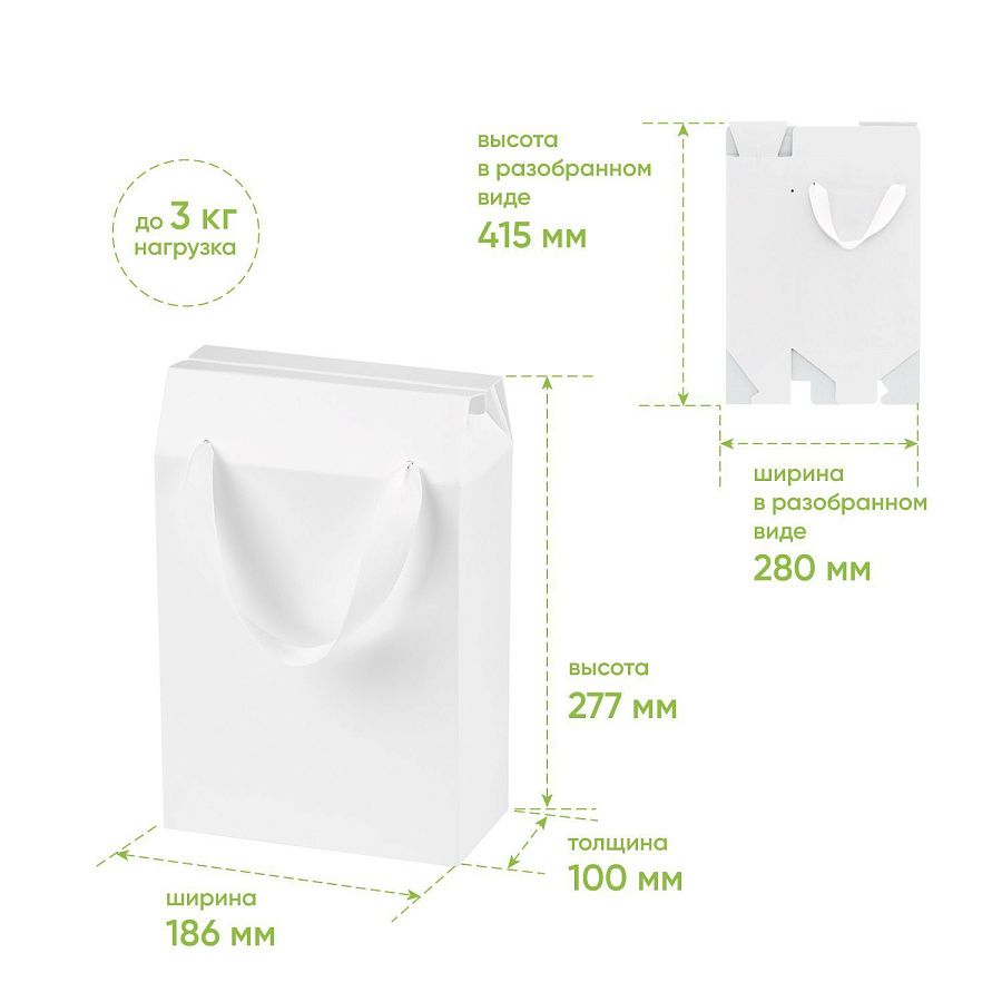 Универсальный пакет – коробка небольшого размера, тем не менее, вмещает различные вариации подарочных наборов. Выполнен в праздничном белом цвете с ручками из репсовой ленты. Станет хорошей упаковкой для подарочного набора.