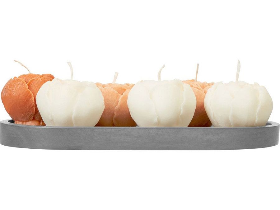 три белых свечи пион, одна темно-персиковая свеча пион, две персиковые свечи пион, подставка гипсобетон, упаковочный материал |