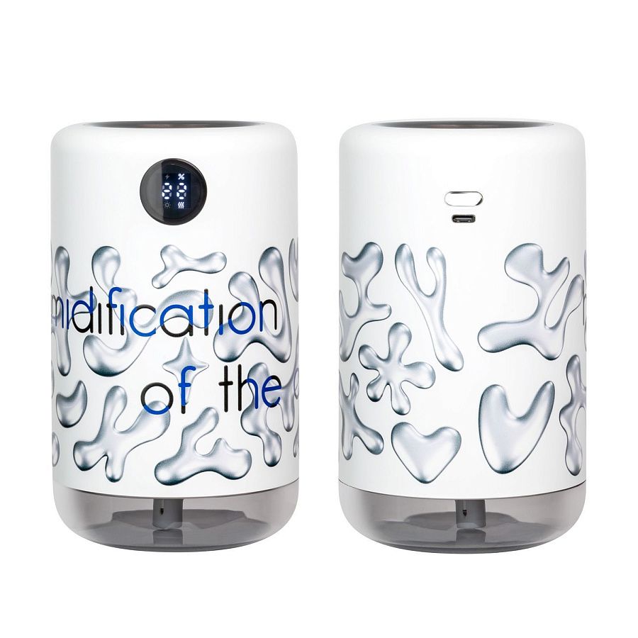 Портативный увлажнитель воздуха со встроенным аккумулятором 2000 mAh и функцией LED-подсветки белого цвета. Технология нано-распыления эффективно снижает сухость воздуха и электронное излучение, что устраняет статическое электричество. Специальное покрытие корпуса OIL PAINT обеспечивает лучшие визуальные и тактильные характеристики пластика. Есть цифровой индикатор заряда батареи. Объем резервуара воды – 500 мл.