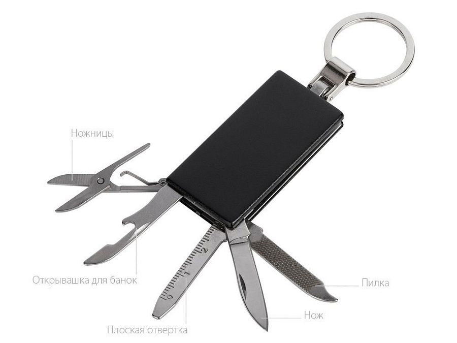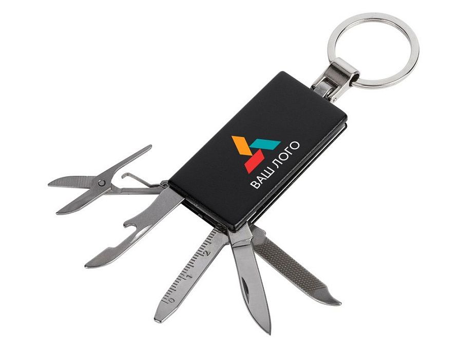Брелок-мультитул на кольце в металлическом корпусе с заметным полем под нанесение.