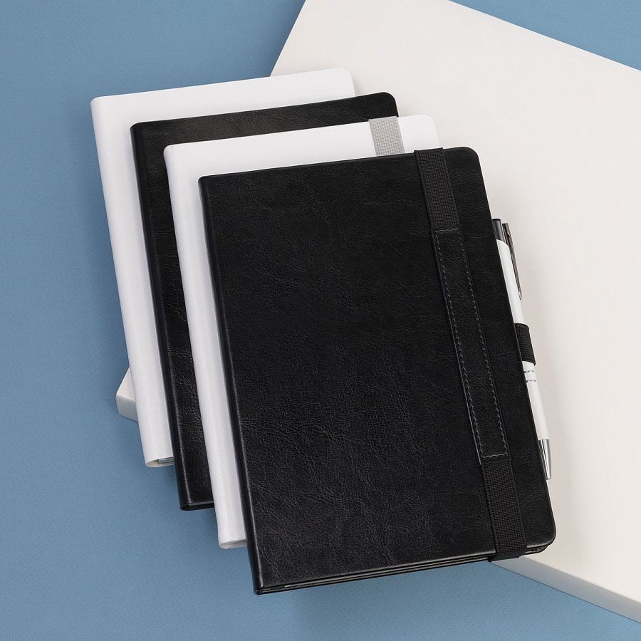 Недатированный ежедневник в жесткой обложке из качественной искусственной кожи. Материал обложки гладкий, текстурированный, с полуглянцевым блеском. Скругленные углы обложки и внутреннего блока. Отличительная особенность коллекции — голографический фольгированный срез блока. Форзац/нахзац– серые. Вариант в жесткой обложке украшен широкой вертикальной резинкой-фиксатором с вставкой из ПУ-материала обложки и петелькой под ручку, а также двойным ляссе (серым и в тон обложки).