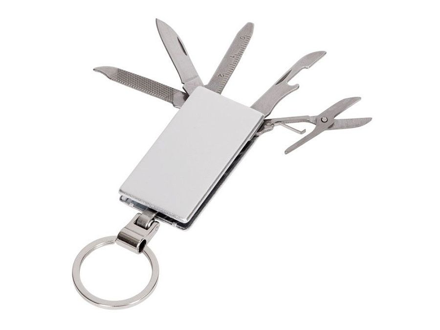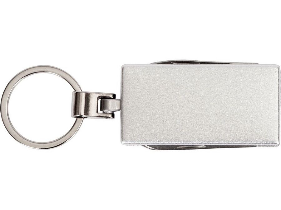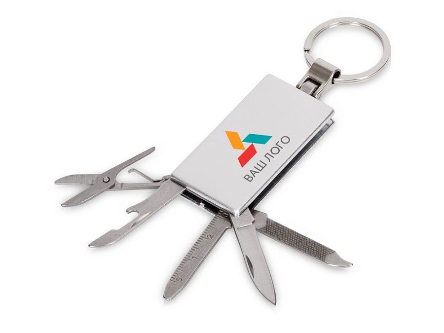 Брелок-мультитул на кольце в металлическом корпусе с заметным полем под нанесение.