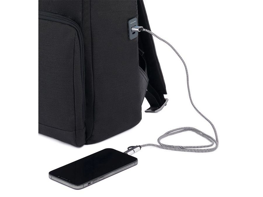 Рюкзак для ноутбука диагональю до 15,6 дюймов, выполненный из переработанных материалов. Имеет защиту от ударов, которая обеспечивает амортизацию и помогает сохранить устройство в целости и сохранности. Особенность этой модели — USB- и micro-USB порты, выведенные наружу, что позволяет заряжать смартфон, держа его в руке, от аккумулятора, лежащего внутри рюкзака.